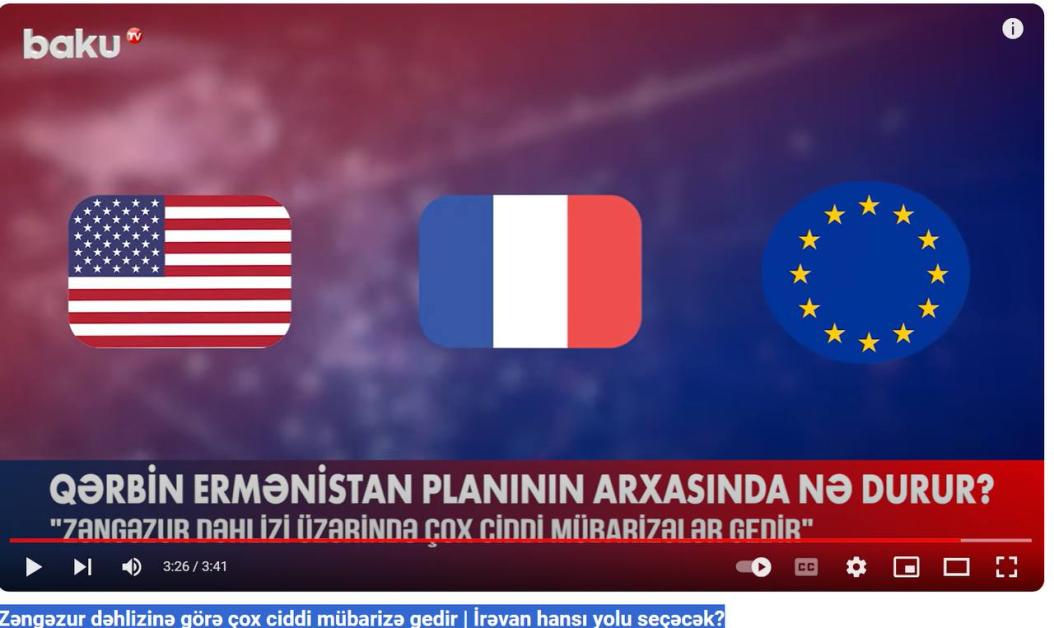 Azerbaijani experts note that the main goal of some Western countries is to inflame the atmosphere of war in the South Caucasus region, because they aim to take control of the "Zangezur Corridor". As you can see from the flags shown in the video, we are talking about USA, France and EU.
